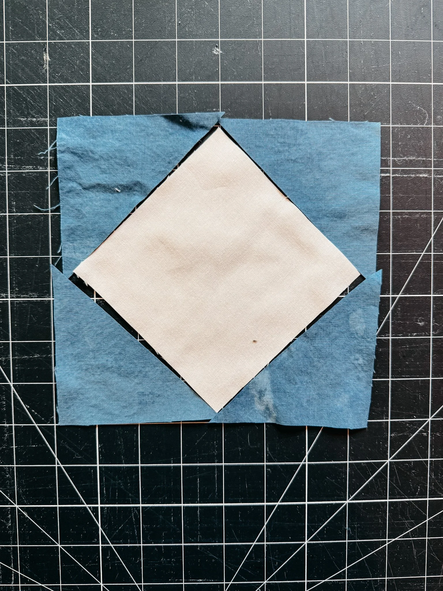 (2) 7" × 7" squares in Color A (e.g., dark blue) Cut corner to corner once creating 2 patches from one square. (4 patches total).