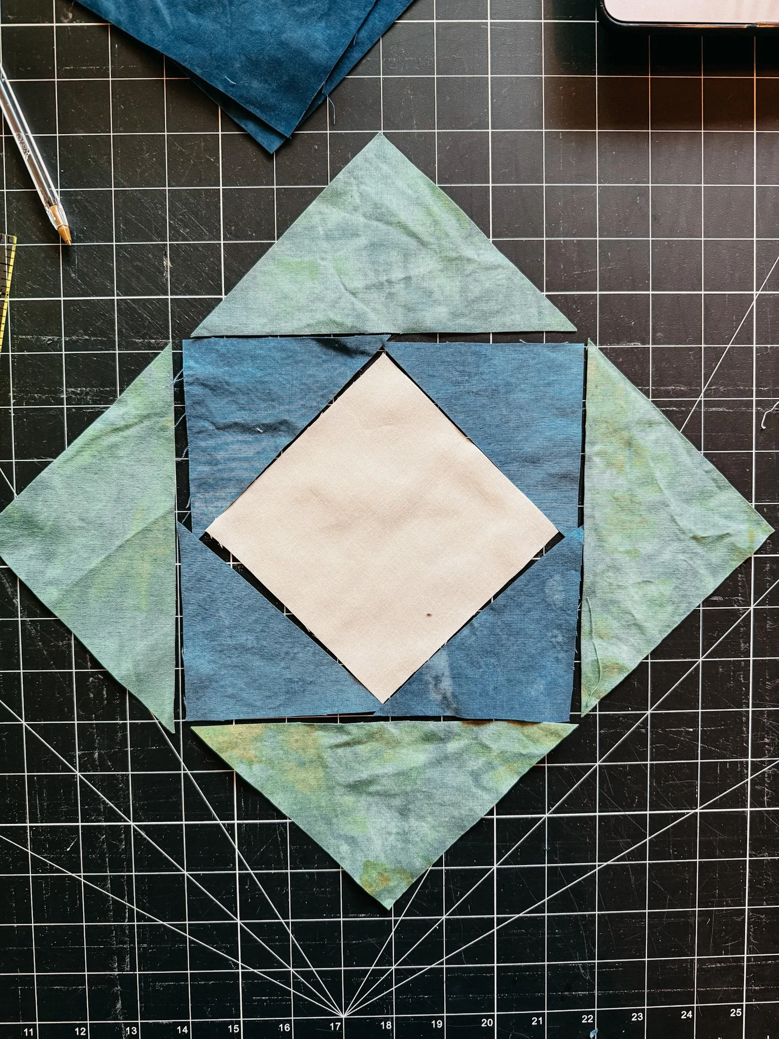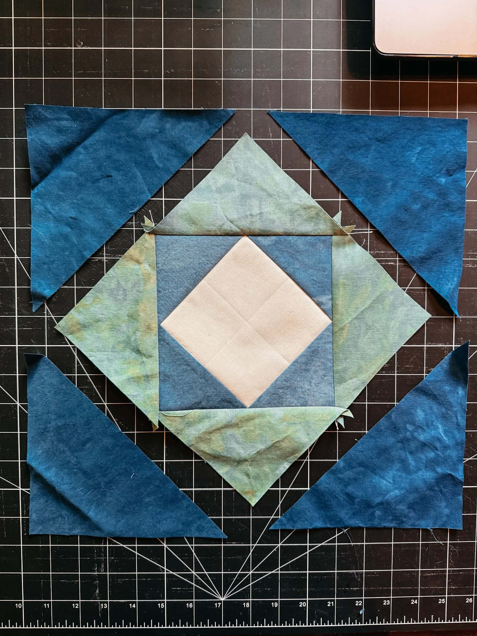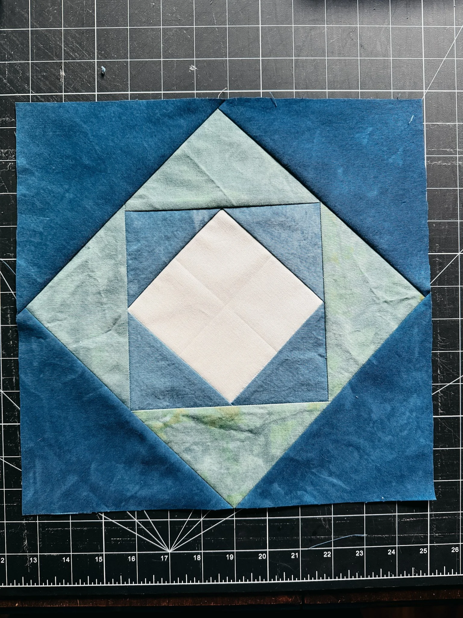 The 12 Triangles (also known as Shadow Boxes in 1980) first made its appearance in The Farm Journal in March 1877 as a 6 x 6” block. Over the years, it was republished dozens of times and made thousands— on e of the many reasons I love quilts so much. This block is a fun one to make. It’s important to start from the center and work your way out. Follow the photos for assembly. Remember to press your seams as you go.